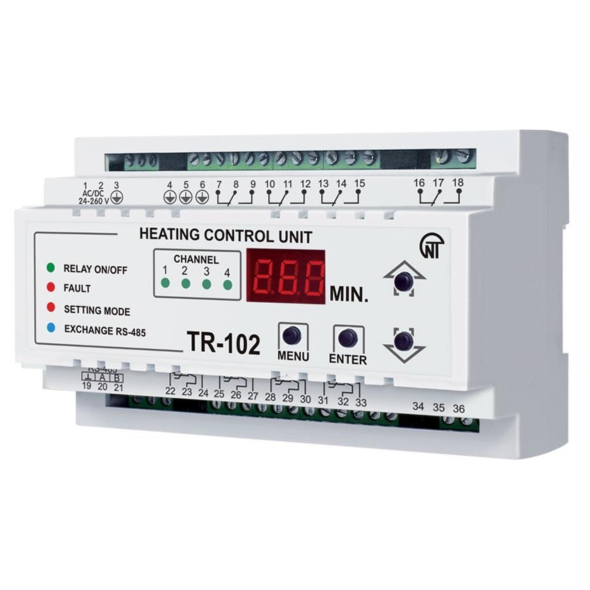The TR-102 heating control unit is designed to maintain the temperature in four zones using thermostat contacts (bimetallic sensor).