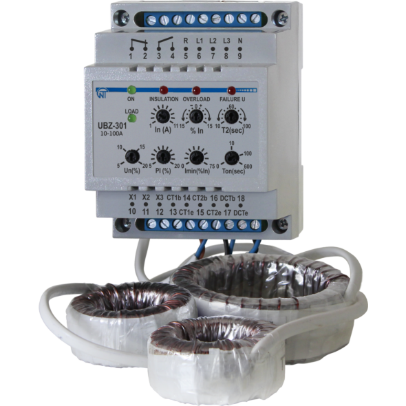 The universal motor protection unit UBZ-301 (10-100A) is designed for continuous monitoring of the mains voltage parameters and the current values of phase/line currents of three-phase equipment 400 V / 50 Hz, primarily induction motors (EM) with power from 2.5 kW to 25 kW, including in networks with an isolated neutral.