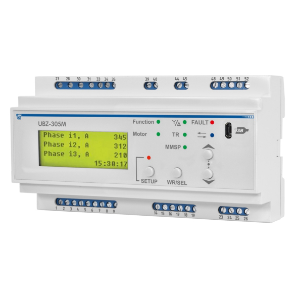 The UBZ-305M is designed to protect asynchronous electric motors with a power range of 2.5 to 315 kW when using external standard current transformers with a 5 A output.