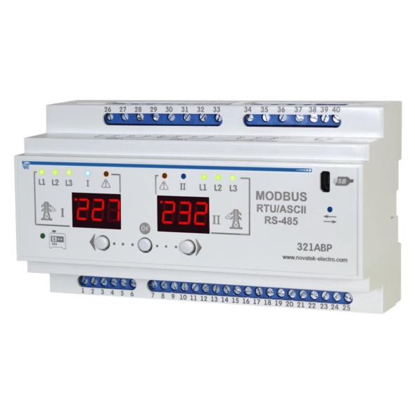 321АВР manages the automatic transfer from the primary three-phase power source to the backup source and back, in cases of unacceptable voltage deviations in the phases, asymmetry or phase imbalance, phase sequence changes, or the loss of one or more phases in either the "primary" or "backup" networks.