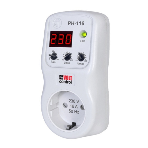 PH-116 voltage relay is designed to protect household appliances (equipment) with a power capacity of up to 3.5 kW (such as refrigerators, air conditioners, washing machines, TV and audio equipment, etc.) from unacceptable voltage fluctuations in the network and the consequences of a neutral wire break.