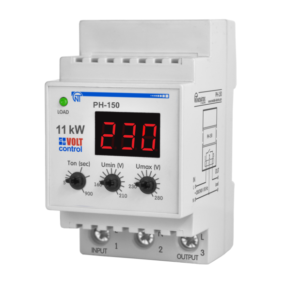 PH-150 voltage relay is designed to protect household appliances (such as refrigerators, air conditioners, washing machines, television, video, and audio equipment, etc.) from unacceptable voltage fluctuations in the network and the consequences of neutral disconnection. The device is rated for load currents up to 50 A.