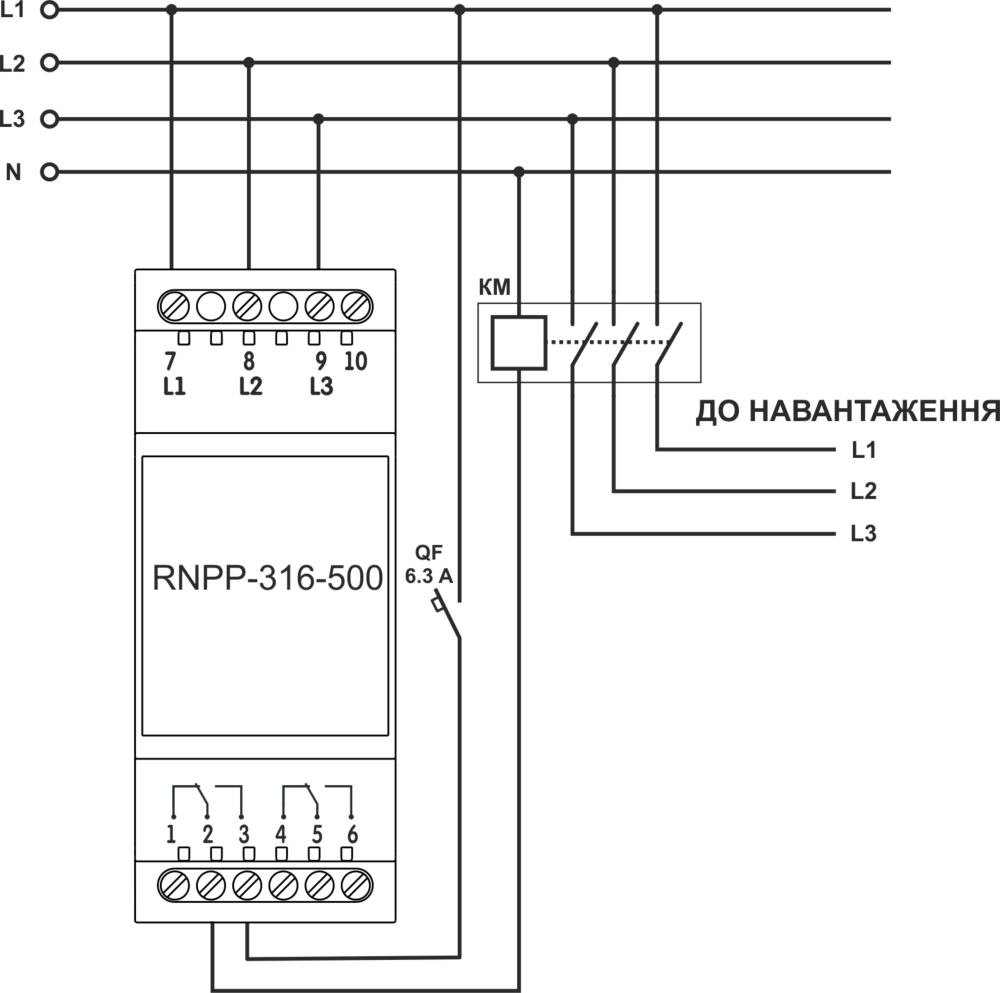 Виріб на виході має дві групи незалежних вихідних перекидних контактів (1-2-3, 4-5-6). В «ХОЛОДНОМУ СТАНІ» (виріб без напруги, не підключений) контакти 1-2 (4-5) замкнені, а контакти 2-3 (5-6) розімкнені.